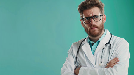 A thoughtful male doctor with glasses and a beard, wearing a white coat and stethoscope, looking directly at the viewer with arms crossed.