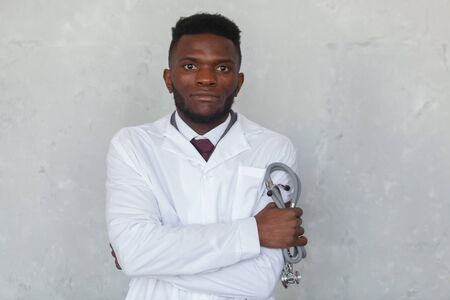 African american male doctor in white coat on gray background. Panoramic banner with copy space.