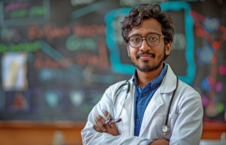 A young, masculine Indian scientist is in front of the chalkboard.