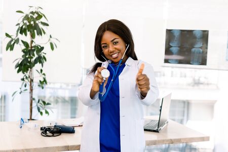 Closeup portrait of friendly, smiling confident African woman healthcare professional in lab coat, stethoscope, gesturing thumb up. Isolated hospital clinic background.