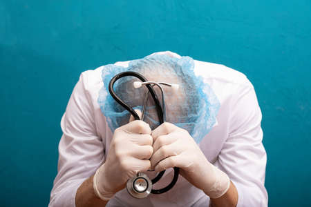 a tired doctor sits, tilted his head and holds a stethoscope in his hands, blue background