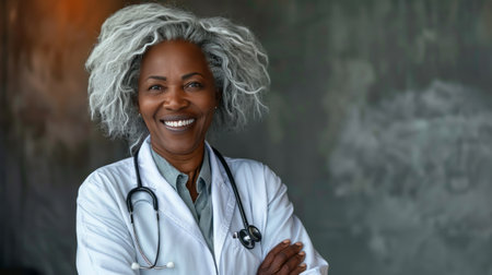 Elderly Afro-American female doctor in white professional clothes, woman smiling. High quality photo