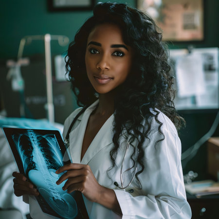 Hospital and doctors help: Beautiful african american radiologist looking at camera and holding x-ray