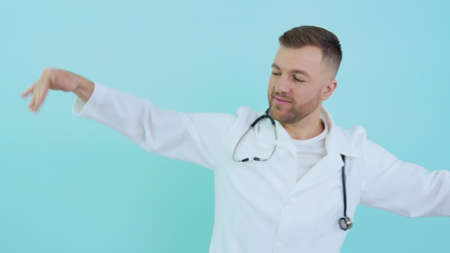 Cheerful successful doctor with stethoscope in white coat dancing on blue background