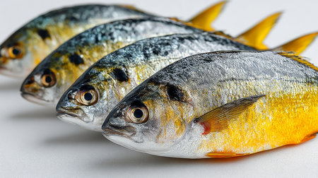 Freshly caught fish lined up on a white surface ready for preparation and cooking in a culinary context