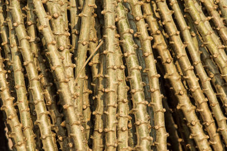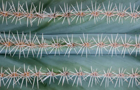 Macro the row of sharp thorns from Columnar cactus in a garden, daylight image, selected focus, empty space for copy and design, Selected focus.