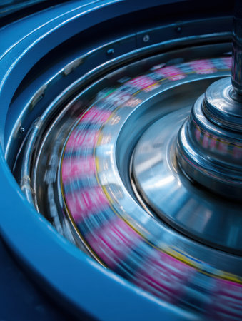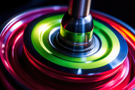 Close-up of spinning machine part in motion with vibrant colors and blurred details