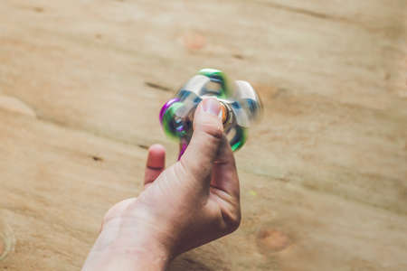 A man hand holding hand spinner or fidget spinner over wooden background.