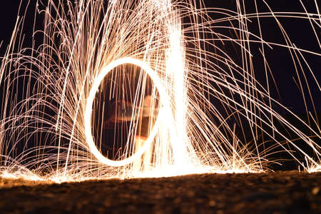 Sparks from spinning steel wool at night.