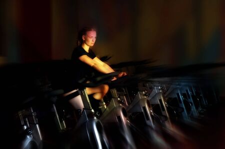 nice girl doing spinning in a gym club with colored light effect