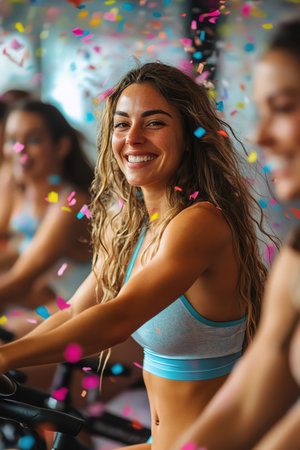 Group cycling class with instructor and colorful neon light streaks in a gym. Clear details and v...
