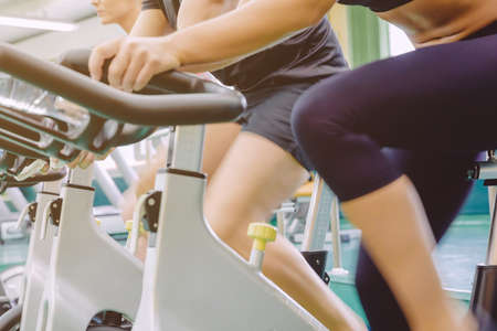 Closeup of people legs in motion during a bike training session on fitness center