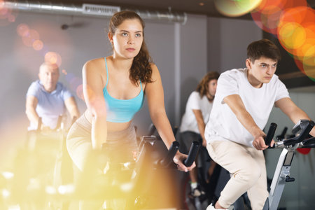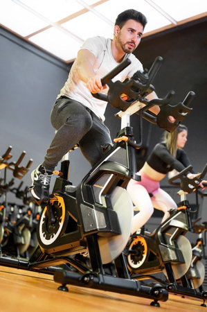 Man and woman taking indoor cycling class at fitness center, doing cardio riding bike