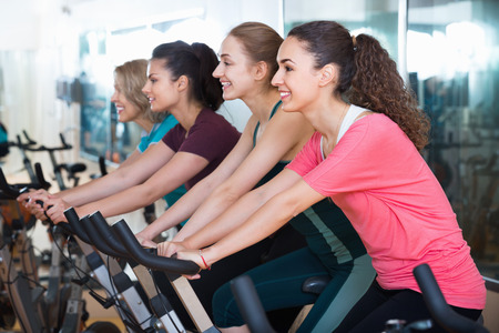 Athletic positive young girls during workout on stationary bicycle in fitness gym