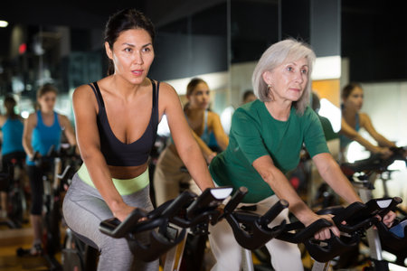 young females riding stationary bicycles in modern gym for women