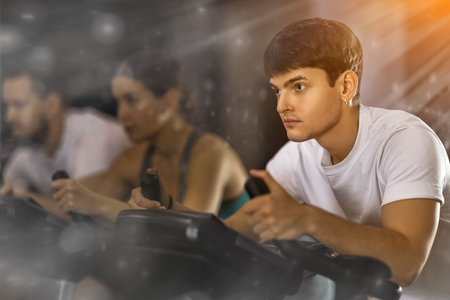 Guy works out with stationary bicycle during class at fitness club, processed photos, special effect