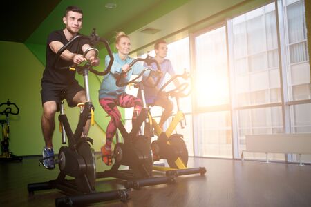 Woman and men doing cardio workout out, training on exercise bike