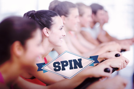 The word spin and fit young people working out at spinning class against badge