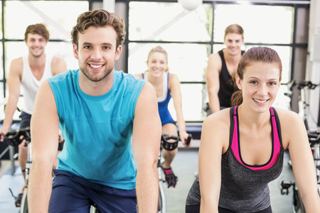 Fit people working out at spinning class in the gym