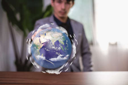 Planet on wooden table with copy space for earth day and saving energy environment concept