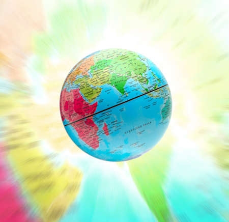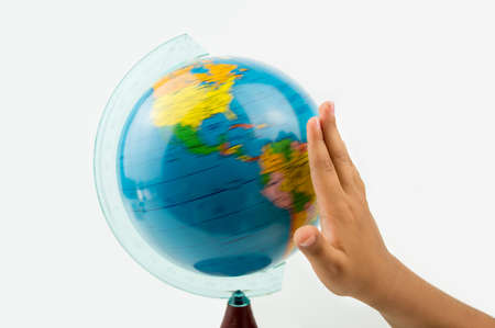 Motion blur of hand spinning the world on white background.