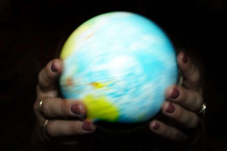 two hands trying to stop a spinning globe.