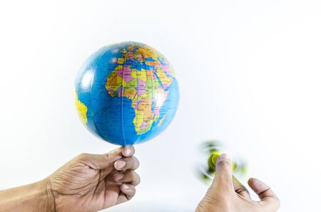 World is spinning and fidget spinner is spinning holding by hand idea isolated in white