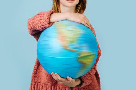 Holding a globe in two hands symbolizes the weight of global issues. The setting suggests awareness and a call to action for environmental stewardship.