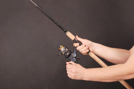 Closeup of fisherman`s hand holding rod with spinning. Fishing reel visible. Selective focus