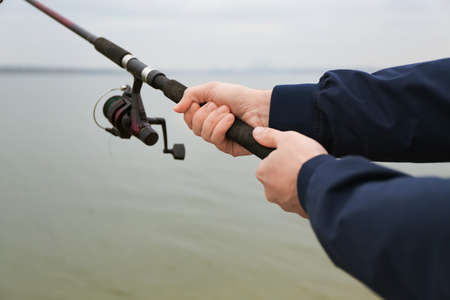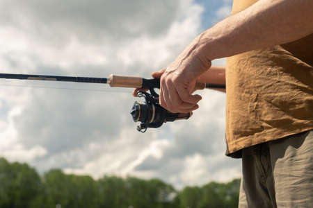 Fisherman is fishing on a spinning. Fisherman's hands with a fishing rod. Cloudy day, outdoor nature with river.