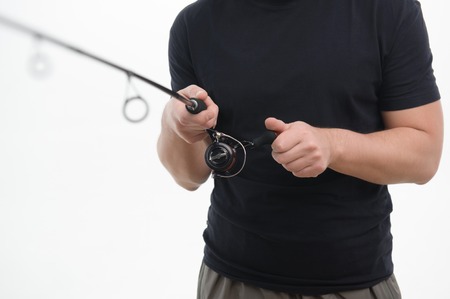 Nice black fishing rod in the hand of man wearing black T-shirt Isolated on the white background