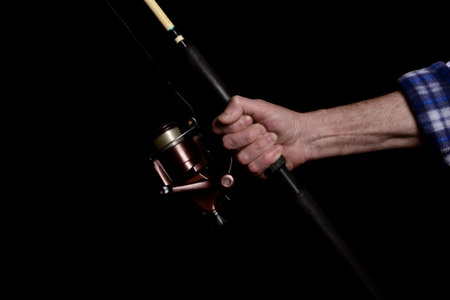 closeup of a hand of an old man holding spinning rod with reel isolated on black background