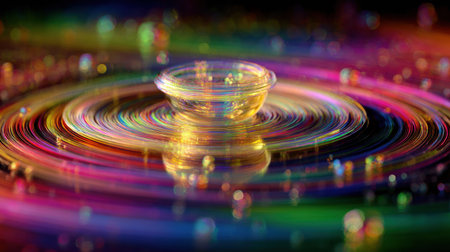 This striking abstract image features a colorful ripple with a droplet resting on a vibrant surface. It captures the beauty of fluid motion and creative inspiration.