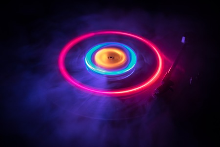 Turntable playing vinyl with glowing abstract lines concept on dark background