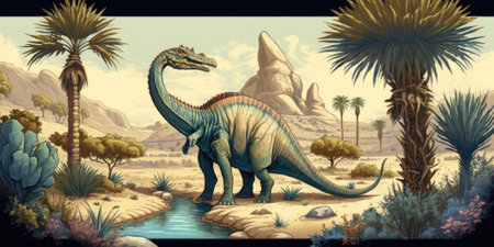 Diplodocus Dinosaur in a whimsical and colorful style. In natural habitat. Jurassic Park