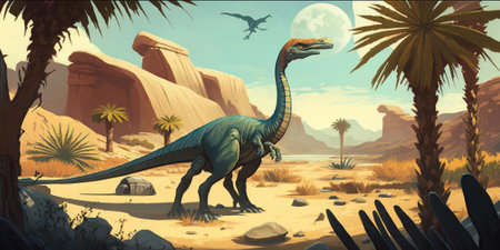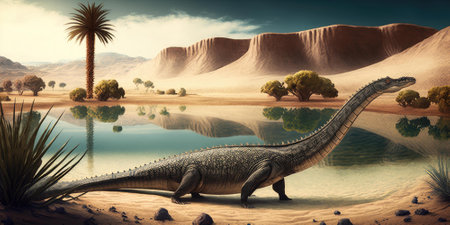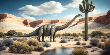 the argentinosaurus, a massive sauropod dinosaur, is depicted in a stunning illustration, boasting an extraordinary feature - a scorpion-inspired tail, blending prehistoric grandeur with arachnid menace, showcasing a fascinating fusion of ancient creatures in a fantastical, otherworldly setting, perfect for fans of paleoart and sci-fi. ai generated