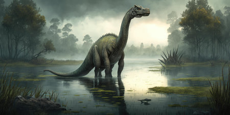 A stunning depiction of a dinosaur in a misty jungle setting, surrounded by lush flora and tranquil waters. This serene scene captures the essence of ancient life on Earth.