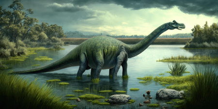 A Brachiosaurus dipping its long neck to browse treetops.. AI generation