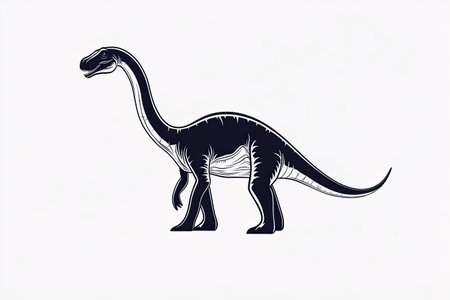 Side profile of a long-necked dinosaur, depicted in a detailed line drawing, showcasing its anatomical features. The image uses black and white to create a bold contrast against the white background, emphasizing the form and texture of the animal.