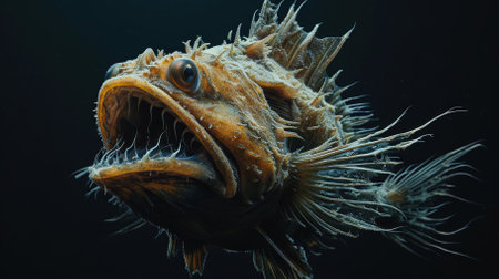 detailed examination showcases the anglerfish recognized for its distinct anatomy and bioluminescent lure set against a stark white background emphasizing its unique adaptations.