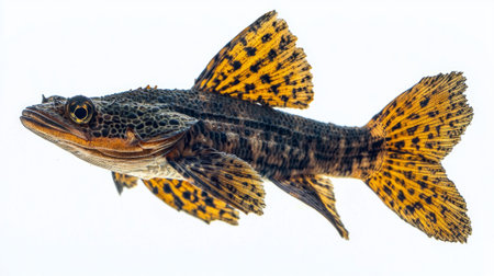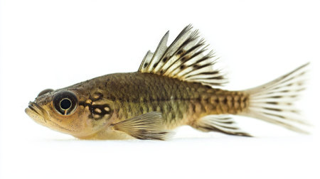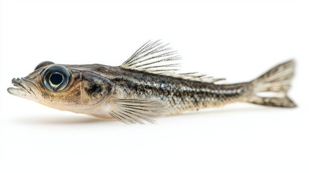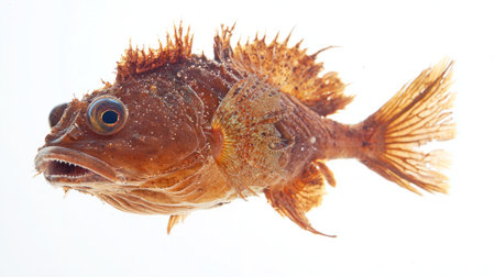 a fish on a white background, captured with the lensbaby composer pro ii and edge 50 optic. the photo showcases a dolly kei-inspired aesthetic with hints of light maroon and gold. the image exudes an unpolished authenticity, combining elements of meatpunk and sharpprickly styles. the intricate and detailed anatomy of the fish is prominently displayed. ai generated