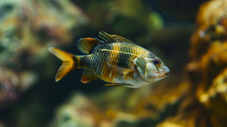 A vibrant freshwater fish swims gracefully through sunlit water, surrounded by aquatic plants. The serene underwater environment showcases nature's beauty and biodiversity.