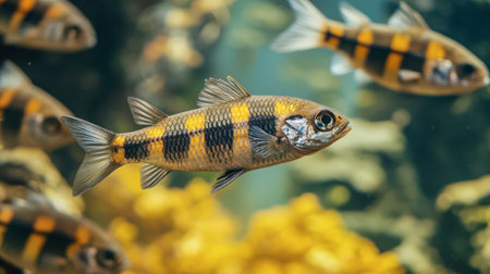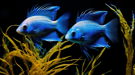 Vibrant tropical fish gliding smoothly, displaying intricate scales and fluid motions inside expansive glass habitat. Concept of tropical fish in aquarium. Ecosystem of aquarium fish