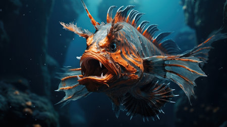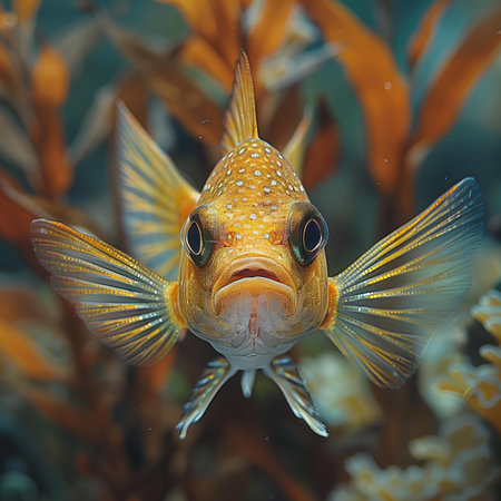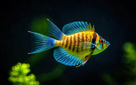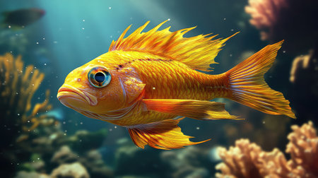 A digitally rendered image showcases a vividly colored fish swimming amidst underwater flora.