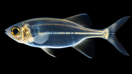 A single translucent fish glows with ethereal blue light while swimming through dark water displaying its visible internal skeleton and large reflective eye.