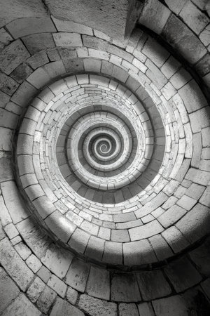 Captivating pattern of a spiral staircase reveals an endless tunnel effect, highlighting the intricate stonework and iron railings in a historic setting
