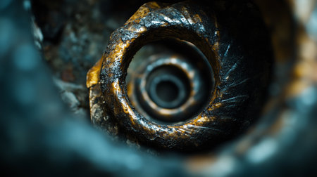 close up view of spiral metal structure, showcasing intricate textures and sense of depth. metallic surface displays wear and age, evoking feeling of industrial history and craftsmanship.