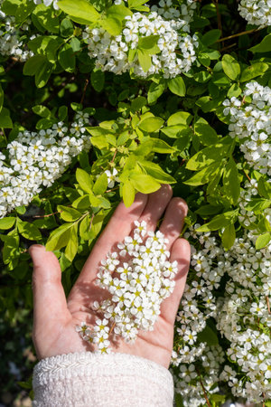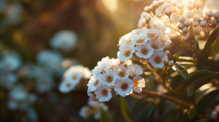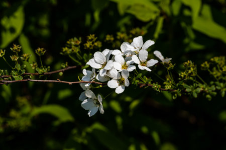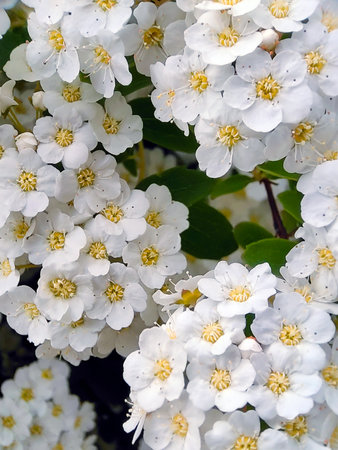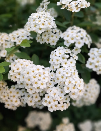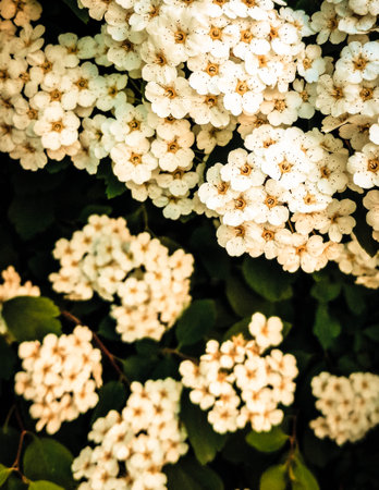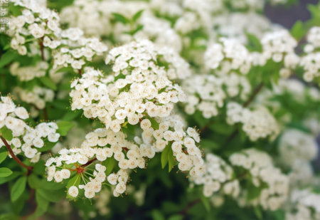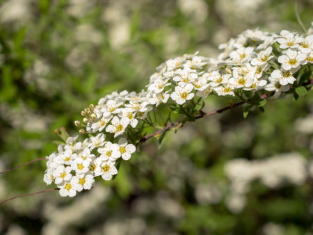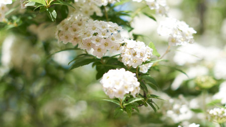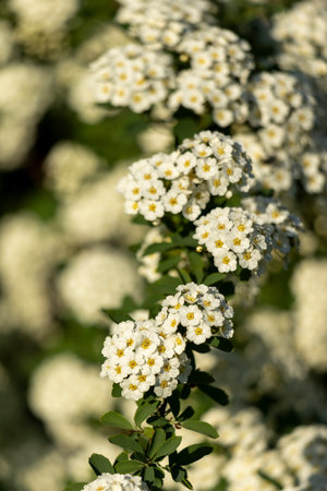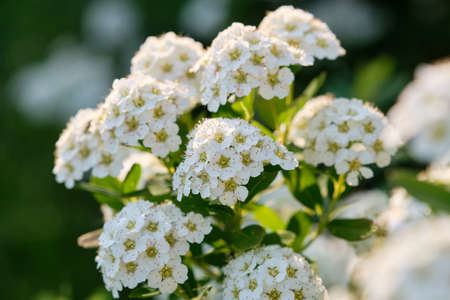 Delicate clusters of white Spiraea flowers blooming in spring sunlight
