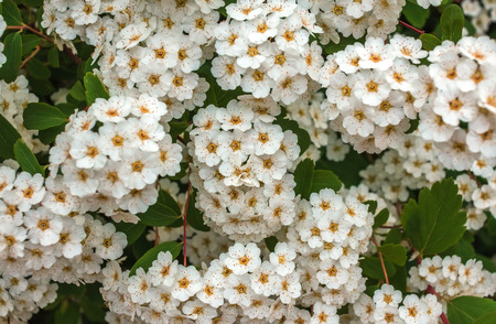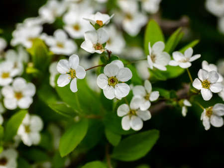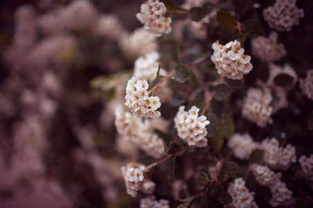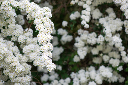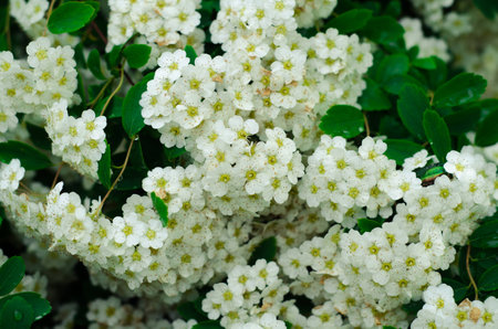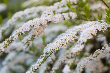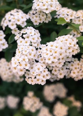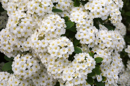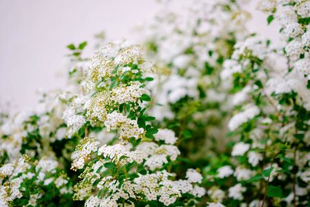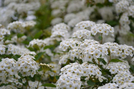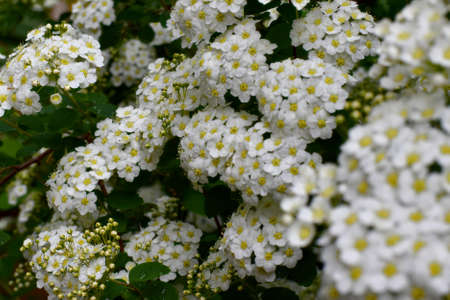 Clusters of small white flowers of spiraea, Grefsheim variety on bush close-up in selective focus, background