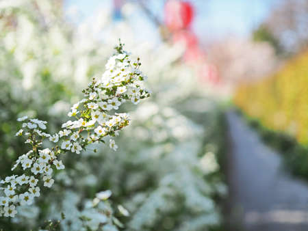 Pretty white blossoms of Thunberg's meadowsweet or Spiraea thunbergii blooming on blurry background in Japan. Tiny white flowers in soft focused beautiful nature flower background.